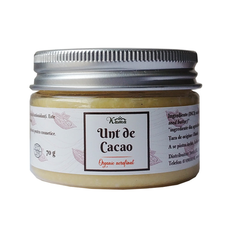 Unt de cacao 100% natural, nerafinat, cu textură fină și aromă delicată de cacao. Ideal pentru hidratarea și îngrijirea pielii, lăsând-o moale și catifelată.