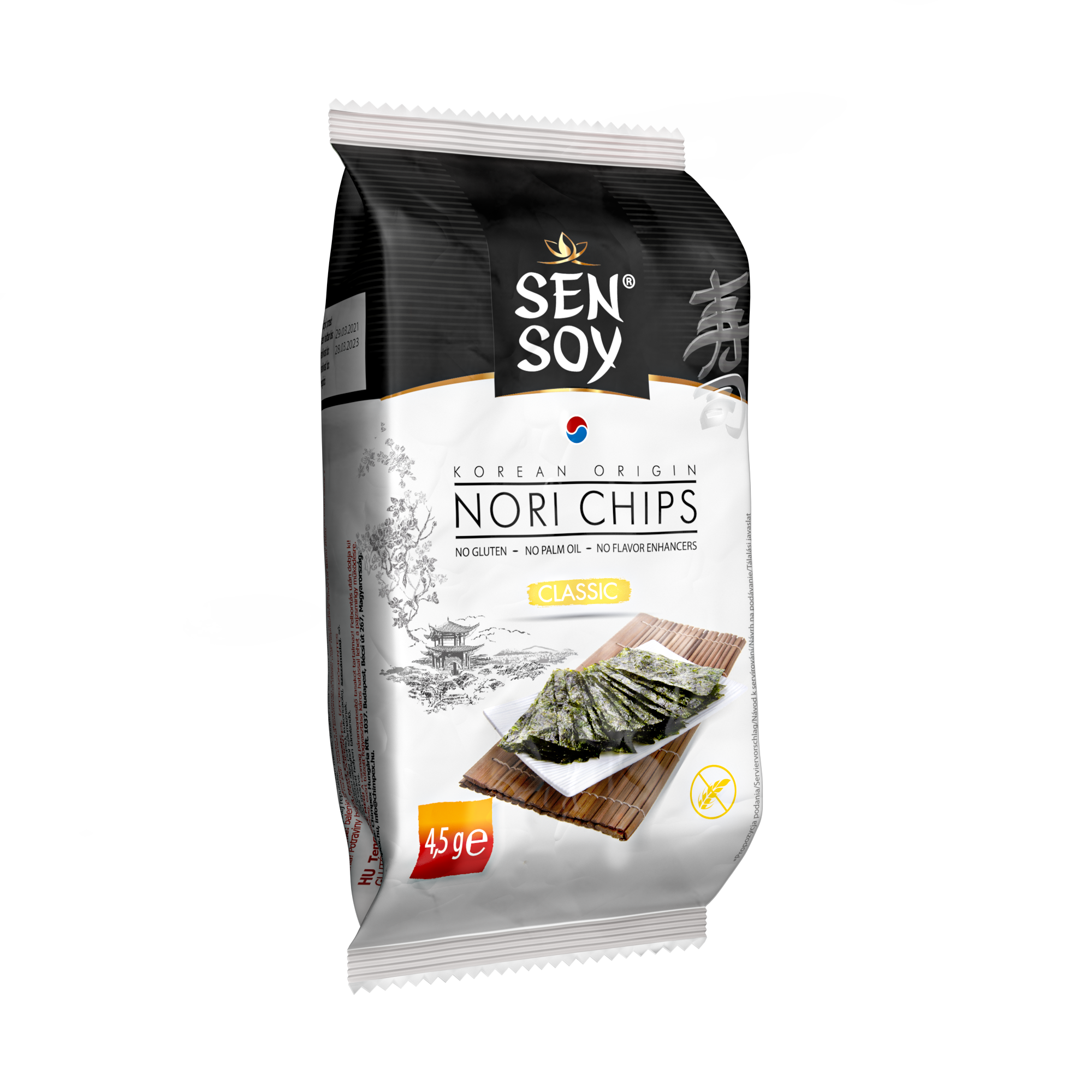 Chipsuri clasice cu Nori – pentru iubitorii gustului clasic al chipsurilor de alge marine. Fulgii crocanți de nori, prăjiți în ulei de susan, păstrează toate proprietățile unice ale algelor marine. Fără gluten, fără ulei de palmier, fără potențiatori de aromă.