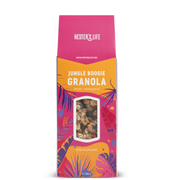 Granola Jungle Boogie Hester's Life – ovăz fără gluten, curmale și ingrediente 100% vegetale, cu afine și zmeură liofilizate, fulgi de ovăz cu vanilie și quinoa crocantă din caju. Gust fructat și crocant, perfect pentru un mic dejun plin de energie și savoare.